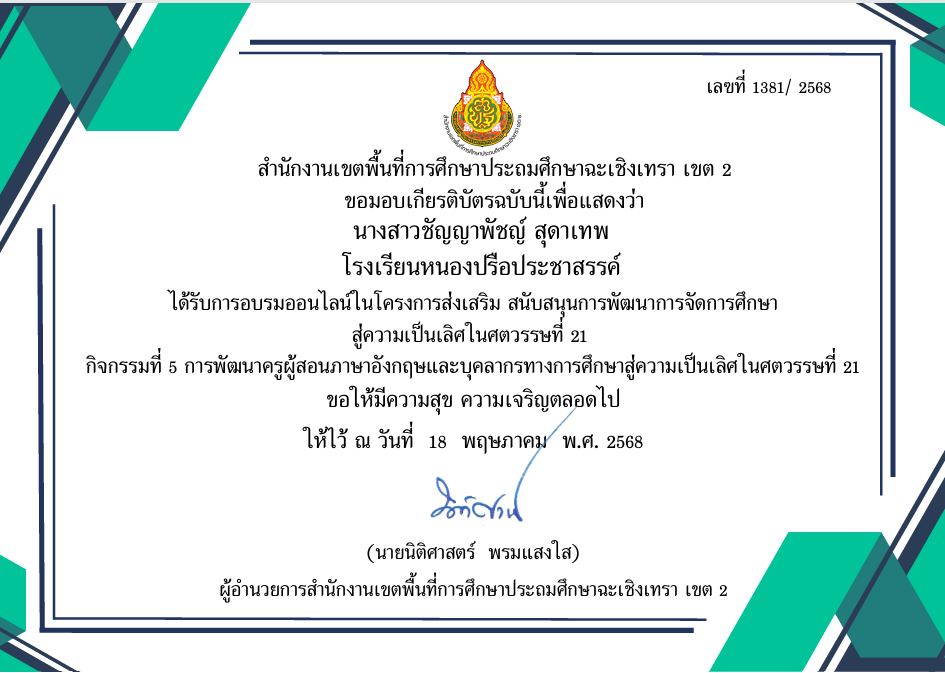 | 185 | นางสุปรียา เพ็งเจริญ | ครู | หนองปรือประชาสรรค์ | การอบรมออนไลน์โครงการส่งเสริม สนับสนุนการพัฒนาการจัดการศึกษาสู่ความเป็นเลิศในศตวรรษที่ 21 กิจกรรมที่ 5 การพัฒนาครูผู้สอนภาษาอังกฤษและบุคลากรทางศึกษาสู่ความเป็นเลิศในศตวรรษที่ 21 | อื่นๆ | เขตพื้นที่การศึกษา | 2025-12-05 | สพป.ฉะเชิงเทรา เขต 2 | เปิดไฟล์ |
