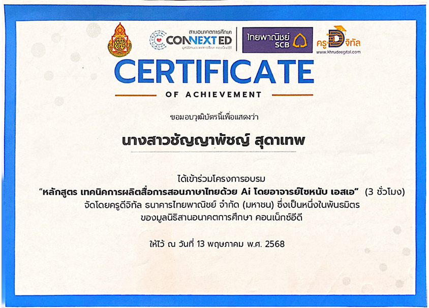 | 190 | นางสาวชัญญาพัชญ์ สุดาเทพ | ครู | หนองปรือประชาสรรค์ | อบรมหลักสูตรเทคนิคการผลิตสื่อการสอนภาษาไทยด้วย AI โดยอาจารย์ไซหนับ เอสเอ | อื่นๆ | ภาค | 2025-05-13 | ครูดิจิทัล ธนาคารไทยพาณิชย์จำกัดมหาชน | เปิดไฟล์ |