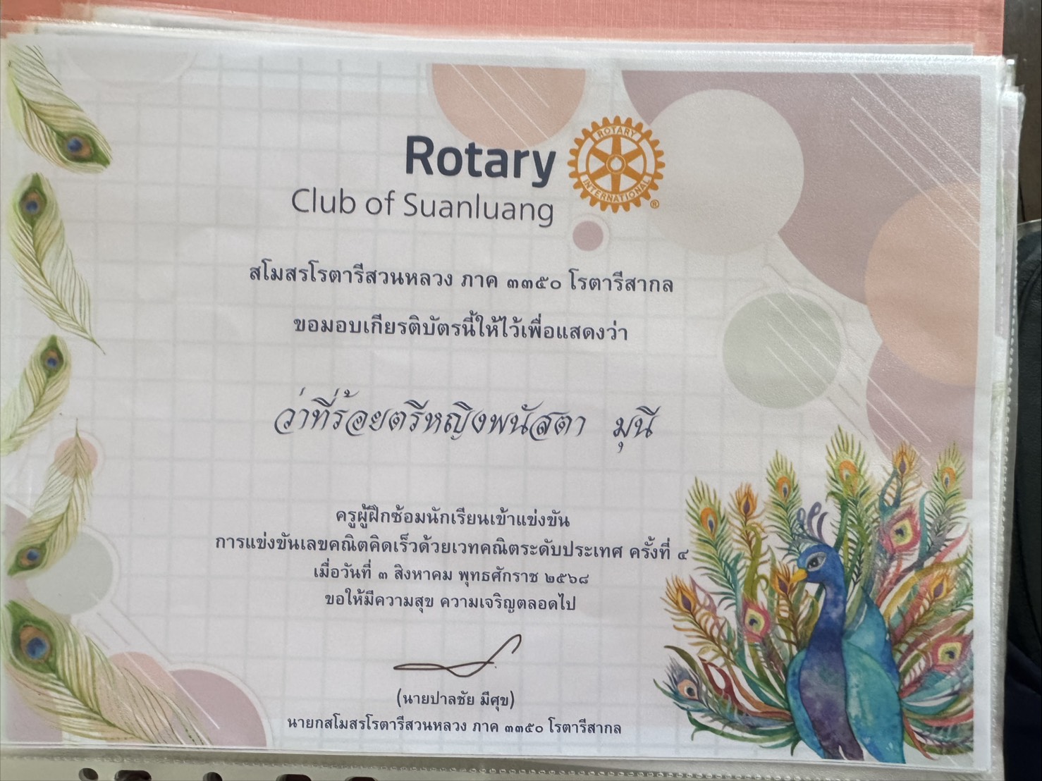 | 60 | ว่าที่ร้อยตรีหญิงพนัสตา มุนี | ครู | วัดเสม็ดใต้ | Rotary Club of Suanluang | อื่นๆ | ภาค | 2025-08-03 | สโมสรโรตารีสวนหลวง ภาค 3350 โรตารีสากล | เปิดไฟล์ |