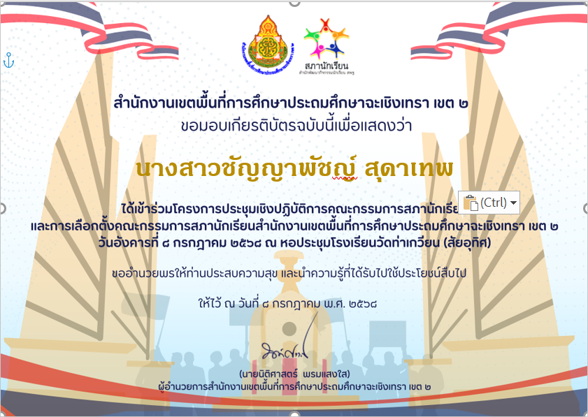 | 77 | นางสาวปนัดดา สุทธิวัฒน์ | ครู | วัดบางโรง | การแข่งขันการสร้างการ์ตูนด้วยโปรแกรมคอมพิวเตอร์กราฟิก ระดับชั้น ป.๑ - ป.๓ งานศิลปหัตถกรรมนักเรียน ระดับเขตคุณภาพ ครั้งที่ 72 ประจำปีการศึกษา 2567 | รองชนะเลิศระดับเหรียญทอง | ระดับเขตคุณภาพการศึกษา | 2025-02-21 | เขตคุณภาพการศึกษาที่ 9 อำเภอคลองเขื่อน จังหวัดฉะเชิงเทรา | เปิดไฟล์ |