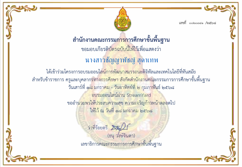 | 197 | นางสาวชัญญาพัชญ์ สุดาเทพ | ครู | หนองปรือประชาสรรค์ | อบรมออนไลน์การพัฒนาสมรรถนะดิจิทัลและเทคโนโลยีที่ทันสมัยสำหรับข้าราชการครูและบุคลากรทางการศึกษาสังกัดสำนักงานคณะกรรมการการศึกษาขั้นพื้นฐาน | อื่นๆ | ชาติ | 2025-01-18 | สำนักงานคณะกรรมการการศึกษาขั้นพื้นฐาน | เปิดไฟล์ |