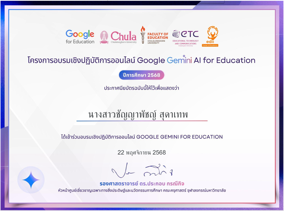 | 193 | นางสาวชัญญาพัชญ์ สุดาเทพ | ครู | หนองปรือประชาสรรค์ | อบรมเชิงปฏิบัติการออนไลน์ google Jemine AI 4 teacher | อื่นๆ | ชาติ | 2025-11-22 | จุฬาลงกรณ์มหาวิทยาลัย | เปิดไฟล์ |