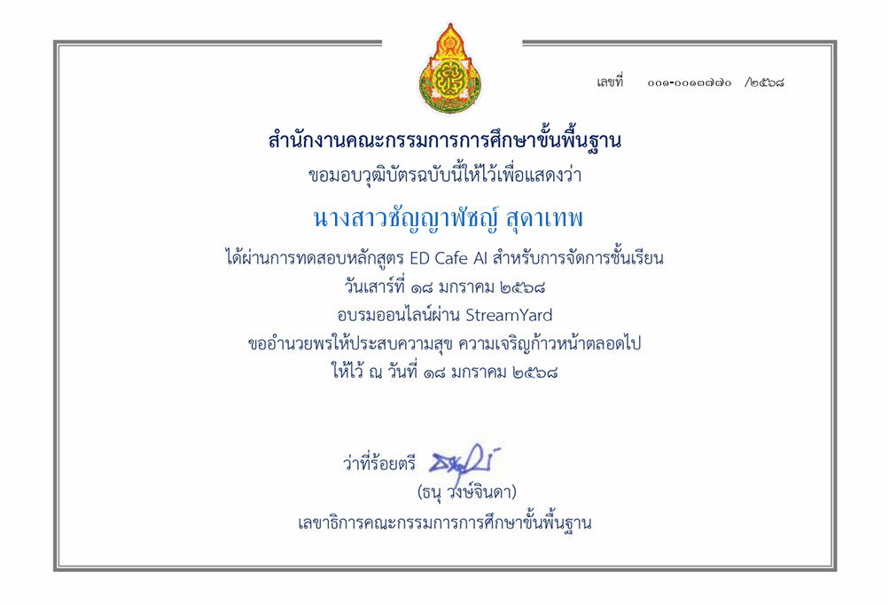 | 195 | นางสาวชัญญาพัชญ์ สุดาเทพ | ครู | หนองปรือประชาสรรค์ | ผ่านการทดสอบหลักสูตร ED Cafe AIสำหรับการจัดการชั้นเรียน | อื่นๆ | เขตตรวจราชการ | 2025-01-18 | สำนักงานคณะกรรมการการศึกษาขั้นพื้นฐาน | เปิดไฟล์ |