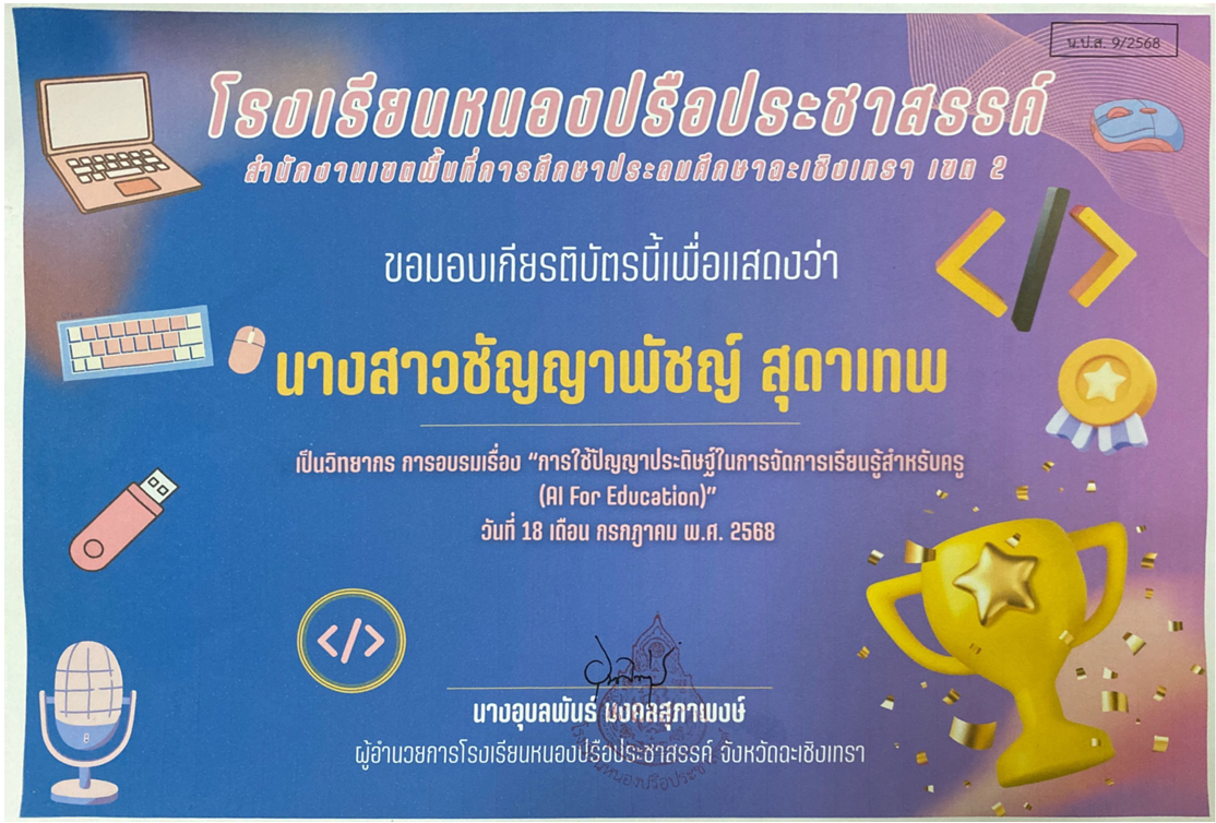 | 192 | นางสาวชัญญาพัชญ์ สุดาเทพ | ครู | หนองปรือประชาสรรค์ | วิทยากรอบรมเรื่องการใช้ปัญญาประดิษฐ์ในการจัดการเรียนรู้สำหรับครู AI for teacher | อื่นๆ | ระดับเขตคุณภาพการศึกษา | 2025-07-18 | โรงเรียนหนองปรือประชาสรรค์ | เปิดไฟล์ |
