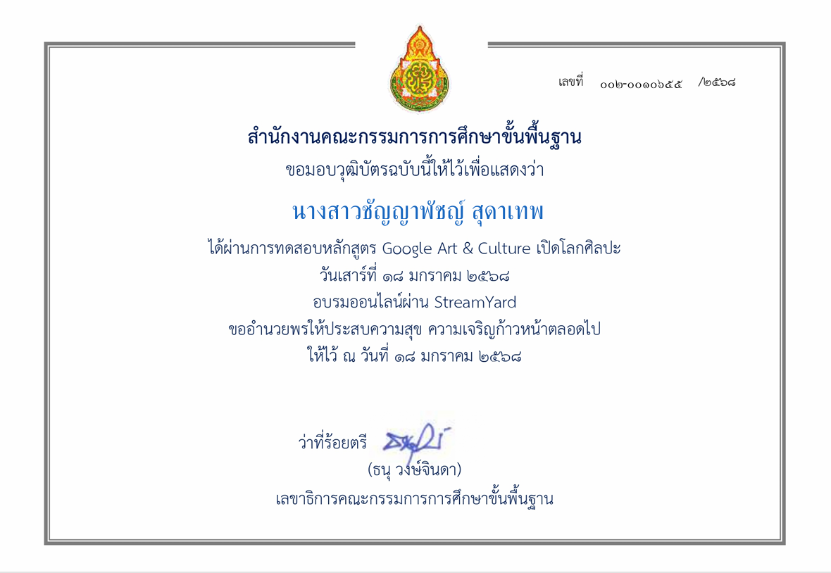 | 196 | นางสาวชัญญาพัชญ์ สุดาเทพ | ครู | หนองปรือประชาสรรค์ | ผ่านการทดสอบหลักสูตร Googlr Art & Culture เปิดโลกศิลปะ | อื่นๆ | ชาติ | 2025-01-18 | สำนักงานคณะกรรมการการศึกษาขั้นพื้นฐาน | เปิดไฟล์ |