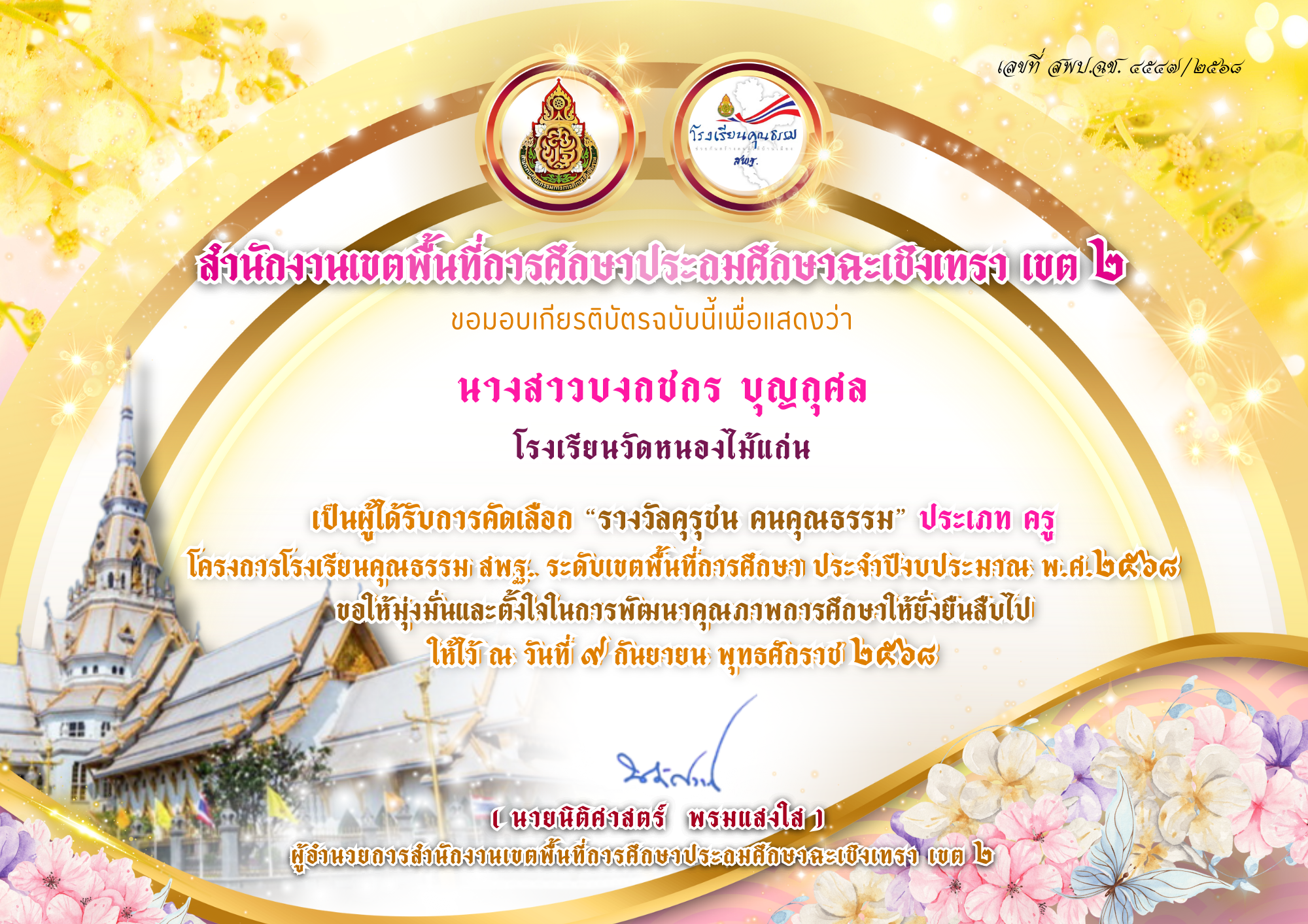 | 183 | นางสาวบงกชกร บุญกุศล | ครู | วัดหนองไม้แก่น | คุรุชน คนคุณธรรม | อื่นๆ | เขตพื้นที่การศึกษา | 2025-09-15 | เขตพื้นที่การศึกษาประถมศึกษาฉะเชิงเทรา เขต 2 | เปิดไฟล์ |