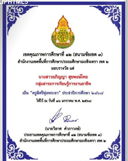 | 12 | นางสาวอภิญญา สุขพงษ์ไทย | พนักงานราชการ | บ้านคลองอุดม | รางวัล "ครูดีศรีทุ่งพระยา" ประจำปีการศึกษา ๒๕๖๗ | อื่นๆ | ระดับเขตคุณภาพการศึกษา | 2025-01-16 | เขตคุณภาพการศึกษาที่ ๑๒ (สนามชัยเขต ๓) | เปิดไฟล์ |