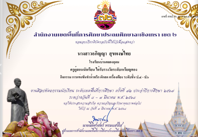 | 13 | นางสาวอภิญญา สุขพงษ์ไทย | พนักงานราชการ | บ้านคลองอุดม | ครูผู้สอนนักเรียน รางวัลระดับเหรียญทอง กิจกรรมการแข่งขันทำน้ำพริก ผักสด เครื่องเคียง ระดับชั้น ป.4-ป.๖ งานศิลปหัตถกรรมนักเรียน ระดับเขตพื้นที่การศึกษา ครั้งที่ ๗๒ | อื่นๆ | เขตพื้นที่การศึกษา | 2025-03-09 | สำนักงานเขตพื้นที่การศึกษาประถมศึกษาฉะเชิงเทรา เขต ๒ | เปิดไฟล์ |
