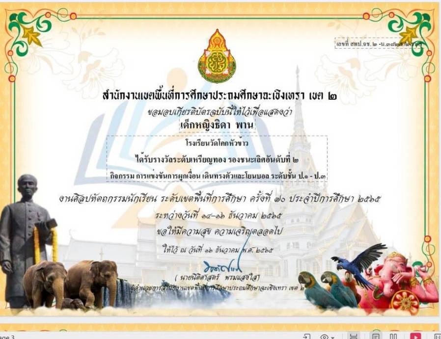 | 1 | เด็กหญิงธิดา พาน | ลูกจ้างชั่วคราว | วัดโคกหัวข้าว | การแข่งขันผูกเงื่อน เดินทรงตัวและโยนบอล | รองชนะเลิศอันดับ 2 | เขตพื้นที่การศึกษา | 2022-12-16 | สำนักงานเขตพิ้นที่การศึกษาประถมศึกษาฉะเชิงเทรา เขต 2 | เปิดไฟล์ |