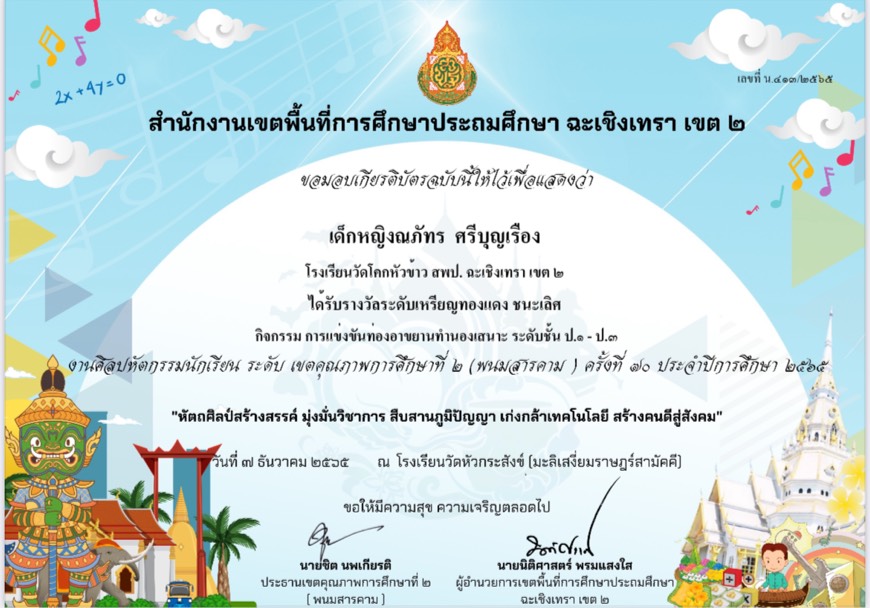 | 1 | เด็กหญิงณภัทร ศรีบุญเรือง | นักเรียน | วัดโคกหัวข้าว | การแข่งท่องอาขยานทำนองเสนาะ ระดับชั้นป.1-3 | อื่นๆ | ระดับเขตคุณภาพการศึกษา | 2022-12-07 | สำนักงานเขตพิ้นที่การศึกษาประถมศึกษาฉะเชิงเทรา เขต 2 | เปิดไฟล์ |