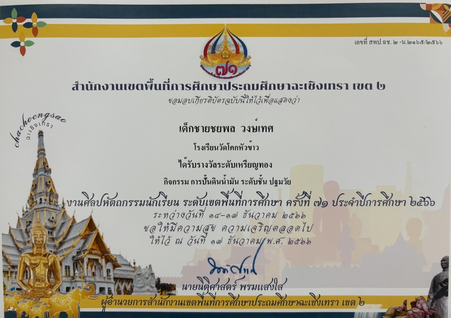 | 2 | เด็กชายชยพล วงษ์เทศ | นักเรียน | วัดโคกหัวข้าว | การแข่งขันปั้นดินน้ำมัน ระดับปฐมวัย | อื่นๆ | เขตพื้นที่การศึกษา | 2023-12-17 | สำนักงานเขตพิ้นที่การศึกษาประถมศึกษาฉะเชิงเทรา เขต 2 | เปิดไฟล์ |
