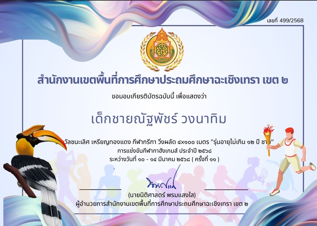 | 5 | ด.ช.ณัฐพัชร์ วงนาทิม | นักเรียน | วัดโคกหัวข้าว | กีฬากรีฑา วิ่งผลัด 4x100 เมตร "รุ่นอายุ ไม่เกิน 12 ปี ผสม" การแข่งขันกีฬากาฮังเกมส์ (ครั้งที่ 11) ประจำปี 2568 | อื่นๆ | เขตพื้นที่การศึกษา | 2025-03-10 | สำนักงานเขตพื้นที่การศึกษาประถมศึกษาฉะเชิงเทรา เขต 2 | เปิดไฟล์ |