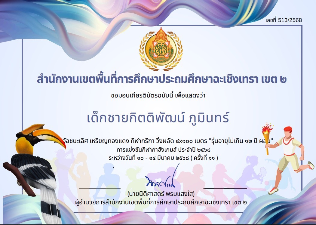 | 6 | ด.ช.กิตติพัฒน์ ภูมินทร์ | นักเรียน | วัดโคกหัวข้าว | กีฬากรีฑา วิ่งผลัด 4x100 เมตร "รุ่นอายุ ไม่เกิน 12 ปี ผสม" การแข่งขันกีฬากาฮังเกมส์ (ครั้งที่ 11) ประจำปี 2568 | อื่นๆ | เขตพื้นที่การศึกษา | 2025-03-10 | สำนักงานเขตพื้นที่การศึกษาประถมศึกษาฉะเชิงเทรา เขต 2 | เปิดไฟล์ |
