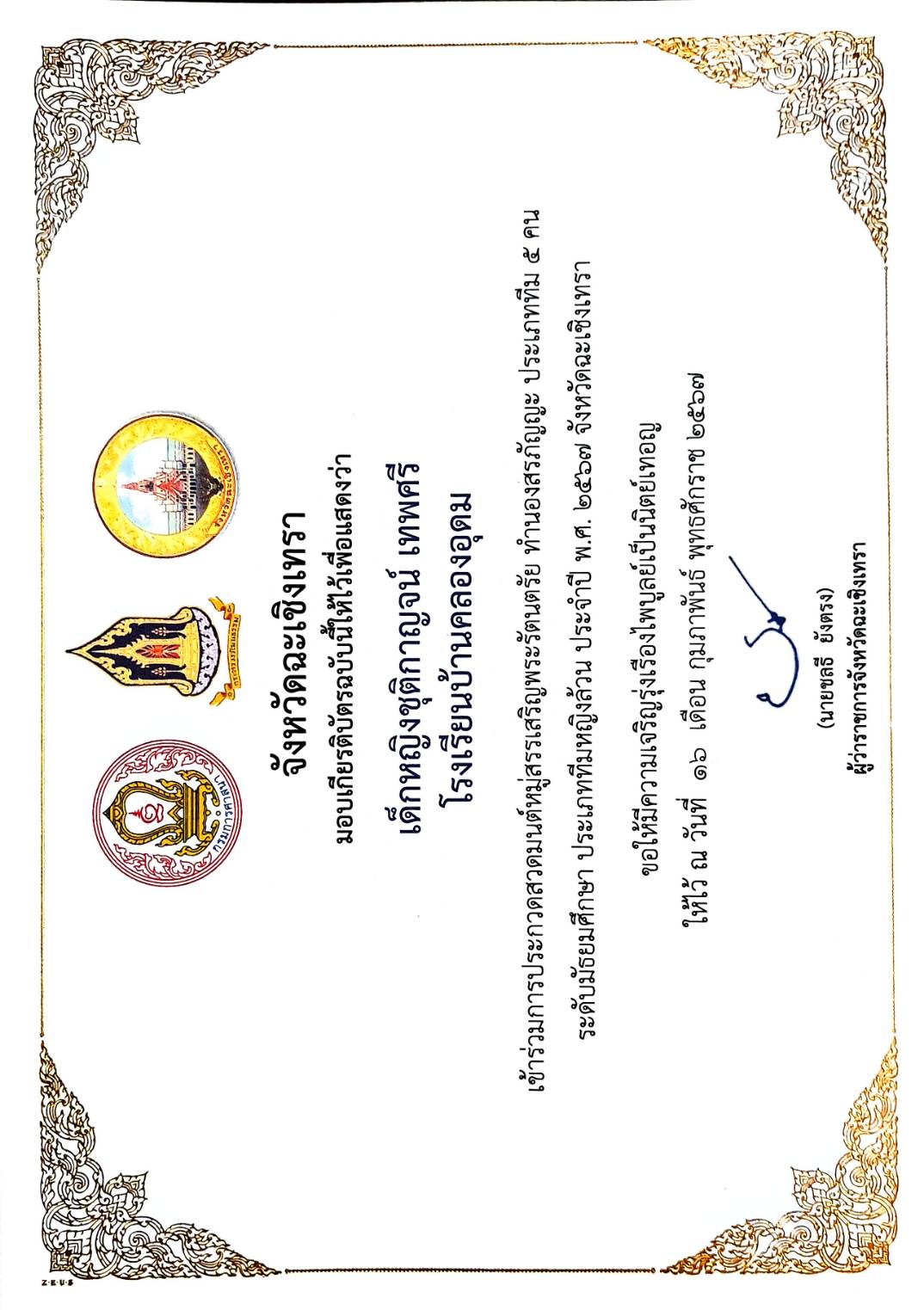 | 24 | เด็กหญิงยลระวีย์ ปัญโญ | นักเรียน | บ้านธรรมรัตน์ใน | การประกวดเพลงคุณธรรม ป.4-ป.6 งานศิลปหัตถกรรมนักเรียน ครั้งที่ 71 ระดับเขตคุณภาพการศึกษาที่ 17 (ท่าตะเกียบ 2) | รองชนะเลิศอันดับ 1 | ระดับเขตคุณภาพการศึกษา | 2566-11-09 | เขตคุณภาพการศึกษาที่ 17 | เปิดไฟล์ |
