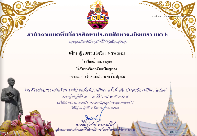 | 15 | เด็กหญิงแพรวไพลิน ศรพรหม | นักเรียน | บ้านคลองอุดม | รางวัลระดับเหรียญทอง กิจกรรมการปั้นดินน้ำมัน ระดับชั้น ปฐมวัย งานศิลปหัตถกรรมนักเรียน ระดับเขตพื้นที่การศึกษา ครั้งที่ ๗๒ | อื่นๆ | เขตพื้นที่การศึกษา | 2025-03-09 | สำนักงานเขตพื้นที่การศึกษาประถมศึกษาฉะเชิงเทรา เขต ๒ | เปิดไฟล์ |