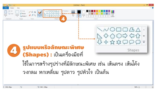 รูปแบบหรือลักษณะพิเศษ (Shapes) : เป็นเครื่องมือที่ ใช้ในการสร้างรูปร่างที่มีลักษณะพิเศษ เช่น เส้นตรง เส้นโค้ง วงกลม หกเหลี่ยม รูปดาว รูปหัวใจ เป็นต้น