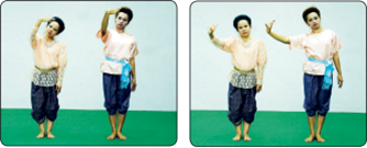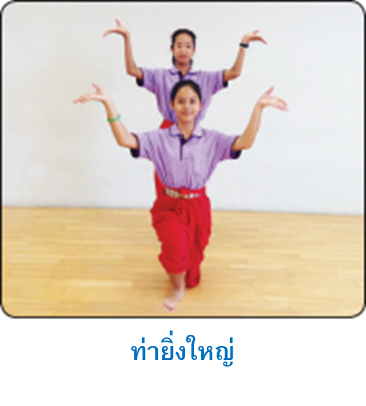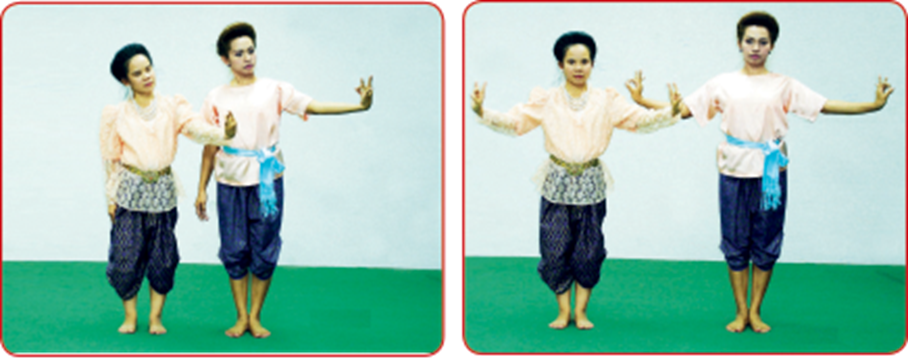 ท่ากล้าหาญหรือสู้ มือข้างหนึ่งตั้งวงบน อีกข้างหนึ่งตั้งวงล่างหรือแตะฝ่ามือที่หน้าขา ก้าวเท้าข้างเดียวกับ