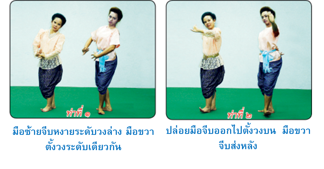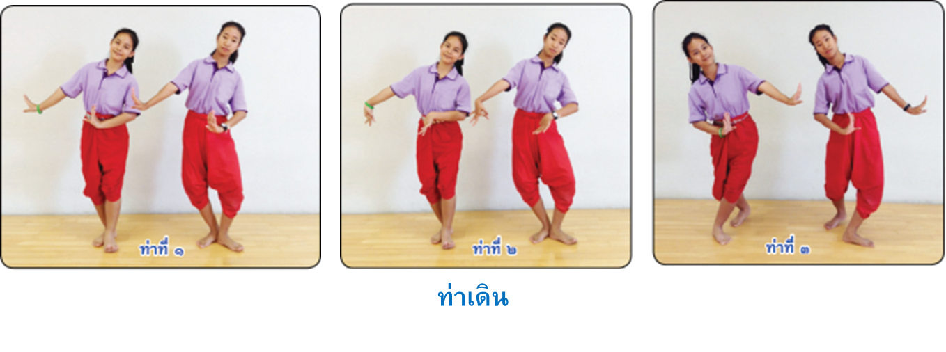 ท่าเดิน การปฏิบัติ ถ้าจะก้าวซ้ายให้มือซ้ายจีบควํ่าบริเวณชายพก มือขวาจีบข้างลำตัว งอแขนเล็กน้อย เอียงซ้ายประสมเท้าซ้าย แล้วเดินมือโดยให้มือซ้ายตั้งวงล่างข้างลำตัว งอแขนเล็กน้อย มือขวา