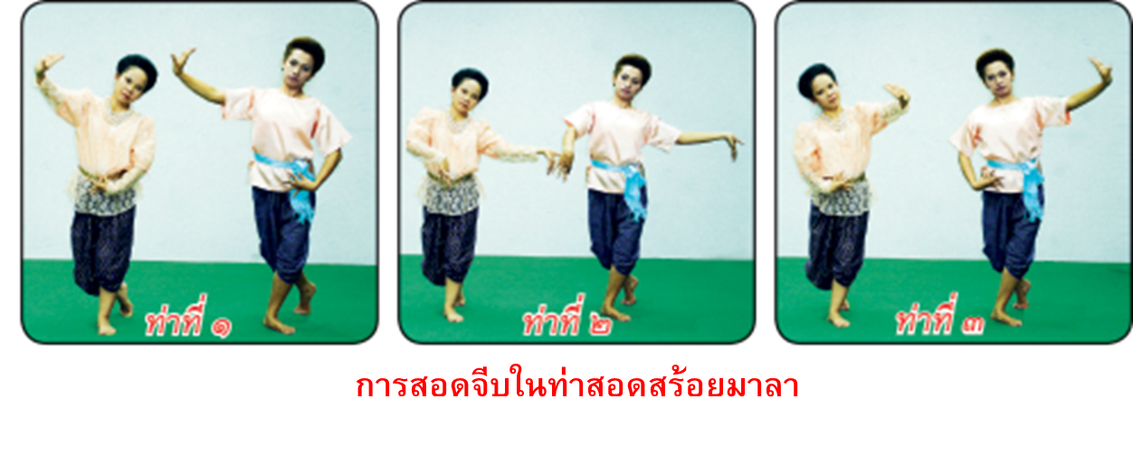 สอดจีบ การสอดจีบจะต้องเริ่มจากการจีบหงายแล้วค่อยๆ เคลื่อนมือจีบให้สูงขึ้นเมื่อถึงที่หมายจึงปล่อยจีบออกไปตั้งวง เช่น ในท่าสอดสร้อยมาลา