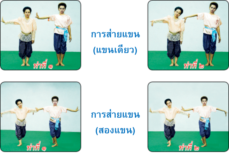 ส่ายแขน การส่ายแขนเป็นกิริยาของการส่ายหรือวาดแขนขึ้น-ลง โดยลำแขนตั้งมือตึงตลอดเวลา ปฏิบัติได้ทั้งส่ายแขนข้างเดียว และพร้อมกันทั้งสองข้าง การส่ายแขนเดียว ท่าที่ ๑ ตั้งมือแขนตึงระดับไหล่ ท่าที่ ๒ วาดแขนลงมาข้างลำตัวแล้วพลิกมือคว่ำหงายท้องแขนขึ้นระดับไหล่ ส่ายแขน การส่ายสองแขน ท่าที่ ๑ ตั้งมือทั้งสองแขนตึงระดับไหล่ มือหนึ่งหงายอีกมือหนึ่งคว่ำ ท่าที่ ๒ วาดแขนข้างหนึ่งลงมาข้างลำตัวแล้วพลิกมือคว่ำหงายสลับกัน