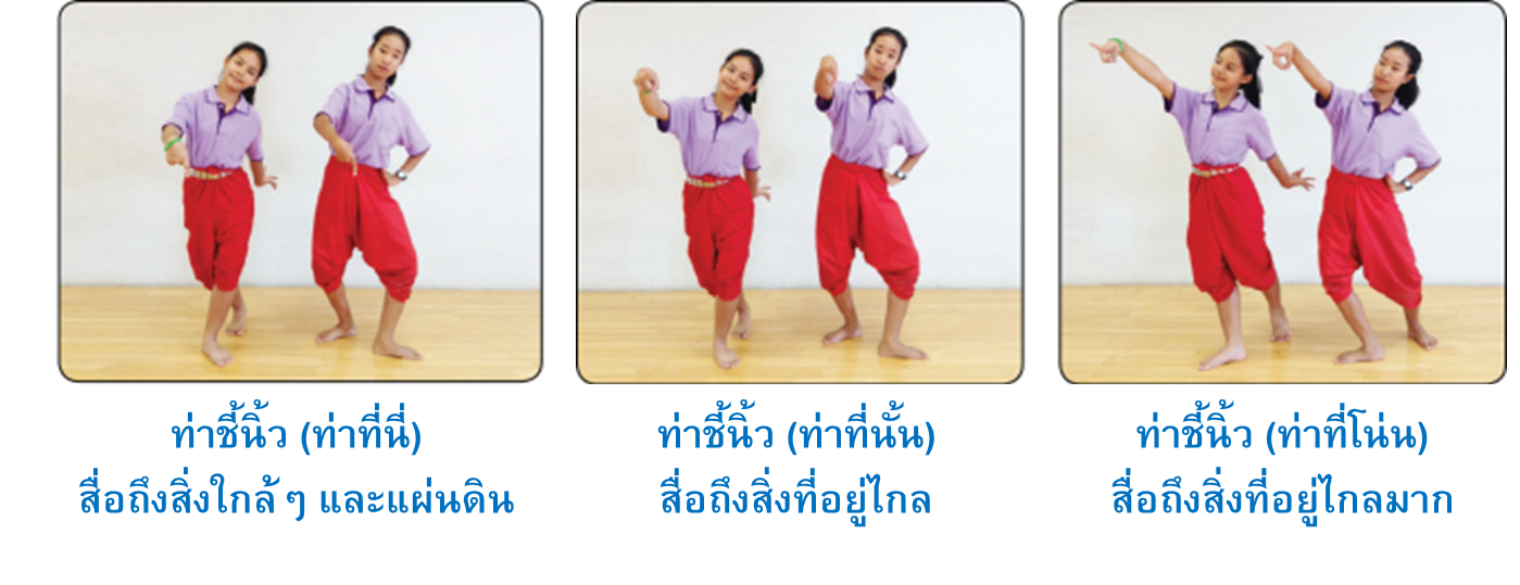 ท่าชี้นิ้ว จะชี้ด้วยมือขวาหรือมือซ้ายก็ได้ ส่วนอีกมือหนึ่งอาจจีบหลังหรือเท้าสะเอว มือที่ชี้มีหลายระดับแต่ละระดับมีความหมายที่ต่างกัน